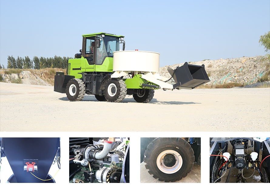 “滾筒旋轉通過齒輪泵和開路中的擺線液壓馬達實現,在操作室內和攪拌機后部擁有手動電氣閥。滾筒通過2個雙作用千斤頂升至水平位置。卸載溜槽通過1個手動可調式手柄控制傾斜,可以90°旋轉,但是不能和攪拌滾筒的傾斜操作同步進行。可拆卸溜槽可以保證直接通過料斗卸載。作為標準配置提供2個溜槽延長部件。